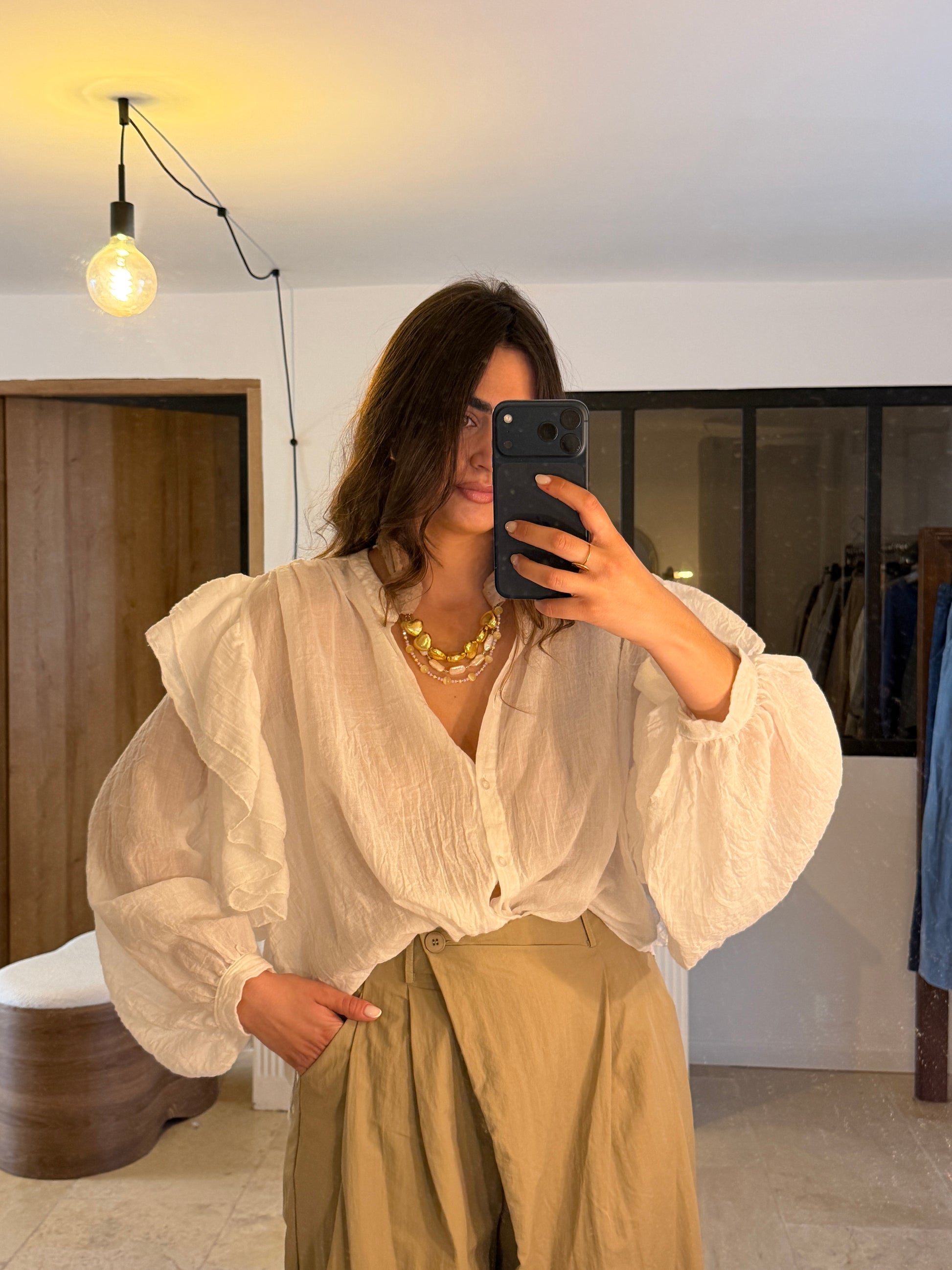 Blouse fluide au charme bohème, sublimée par de larges volants structurés sur les épaules qui apportent du relief et une vraie signature mode. Sa coupe ample et aérienne offre un tombé naturel et un confort absolu.