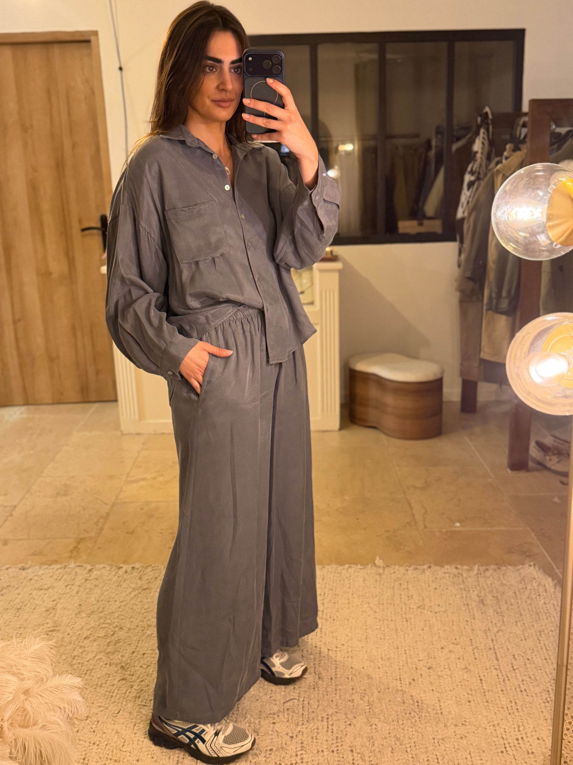 L’ensemble Amandine est la définition parfaite du chic décontracté. Composé d’une chemise fluide et d’un pantalon large assorti, il offre une silhouette élégante tout en restant incroyablement confortable. Une tenue facile à vivre, pensée pour le quotidien comme pour les moments plus habillés.