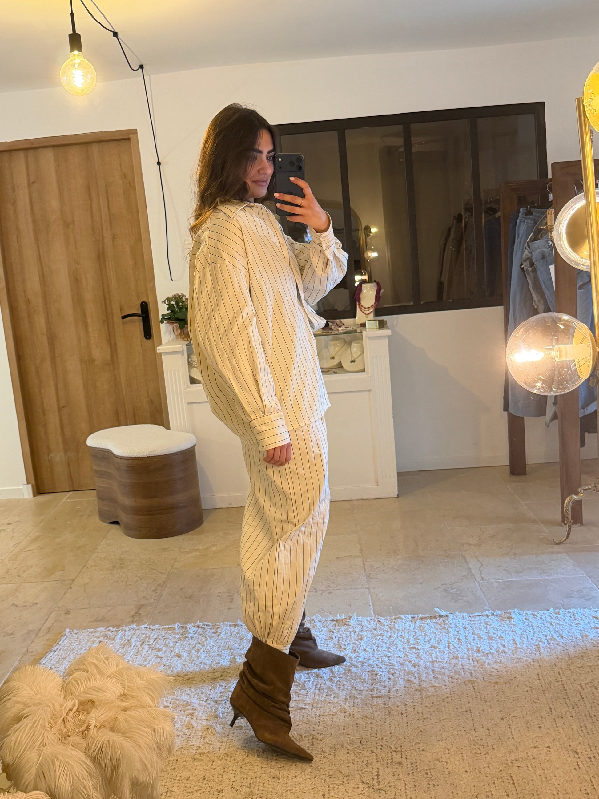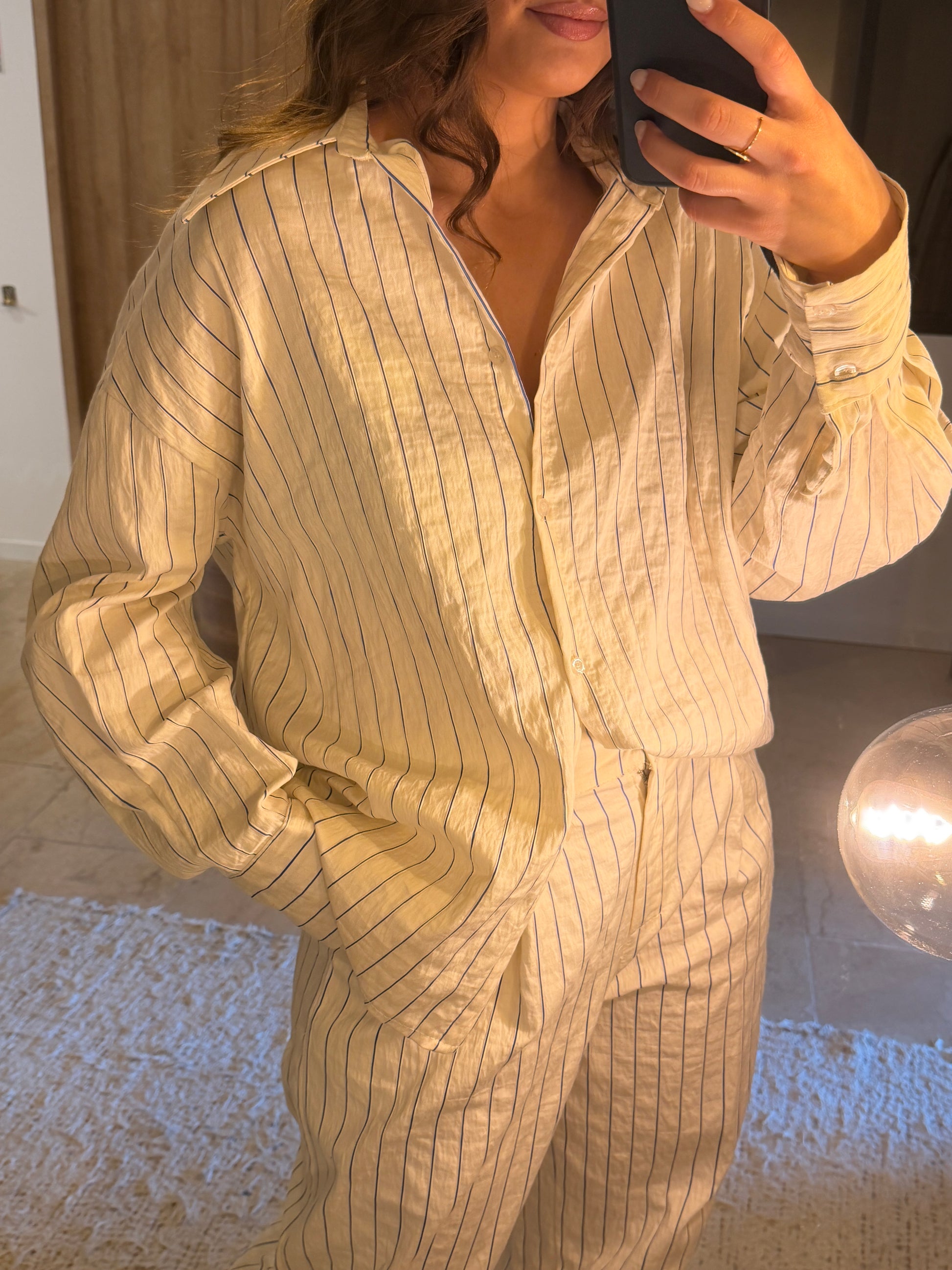 Ensemble deux-pièces en 100% coton, à la fois confortable, respirant et facile à porter au quotidien. Son tissu léger et souple apporte un tombé naturel tandis que les rayures fines verticales allongent la silhouette avec élégance.