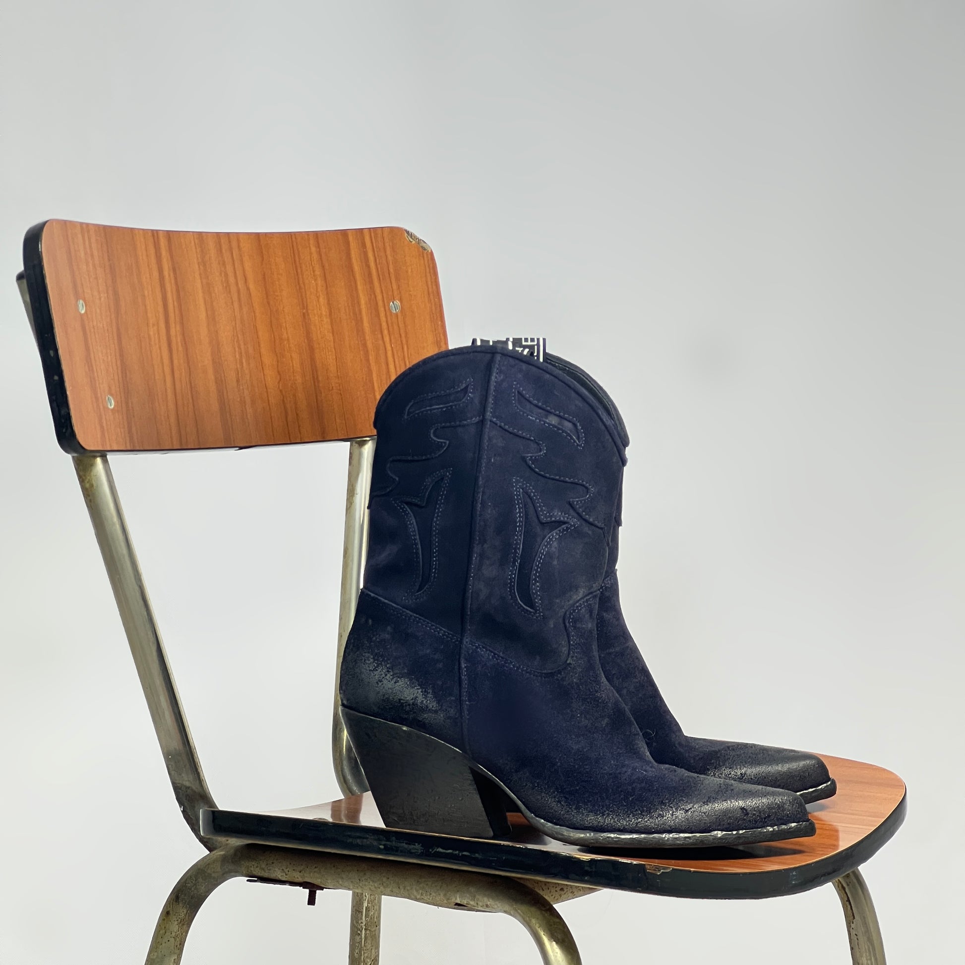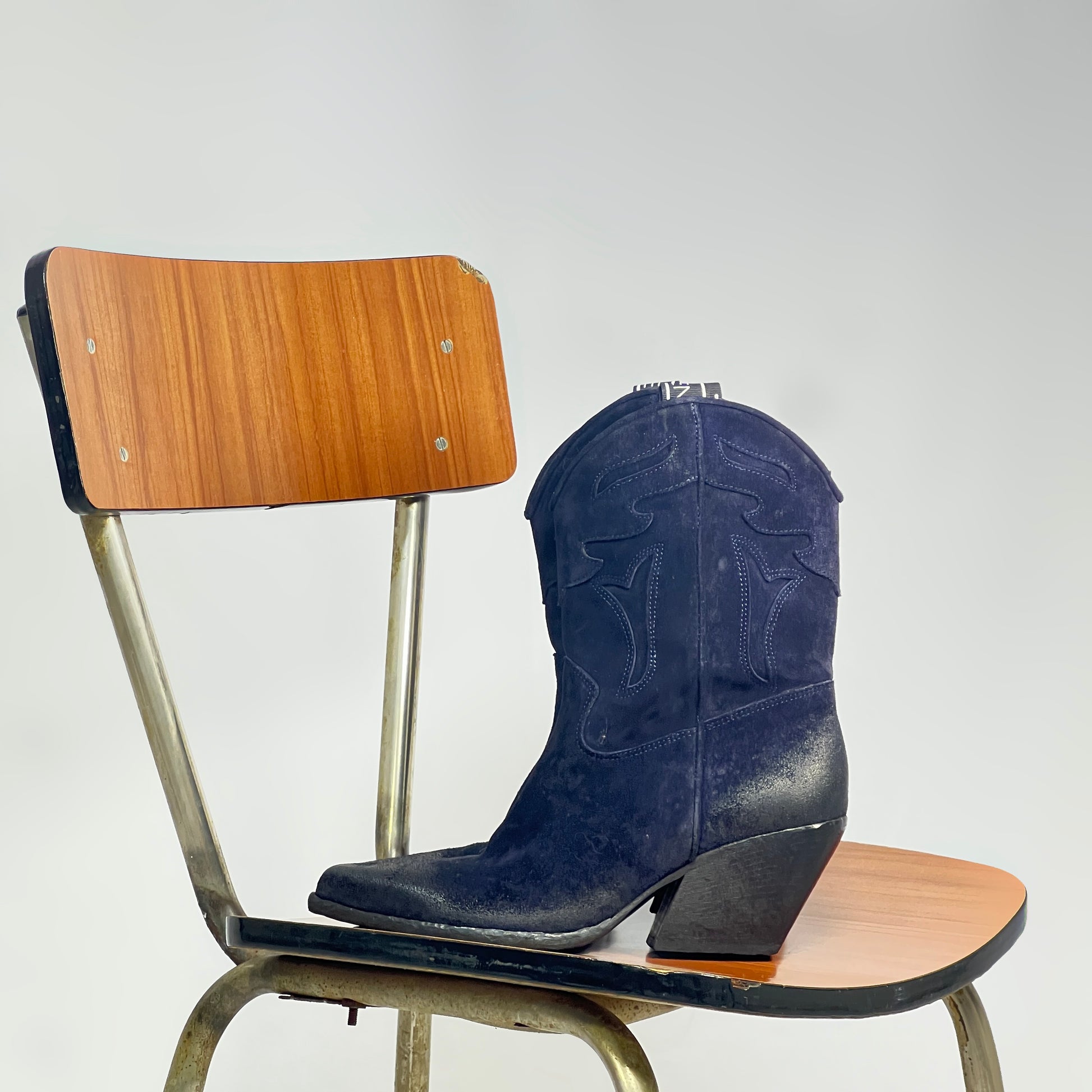 Vous cherchiez les Santiags bleu marine de vos rêves ? Le modèle Lucas est là ! Avec cet effet métallique aux extrémités de la chaussure, ainsi que les reliures et motifs décoratifs, cette paire est unique !