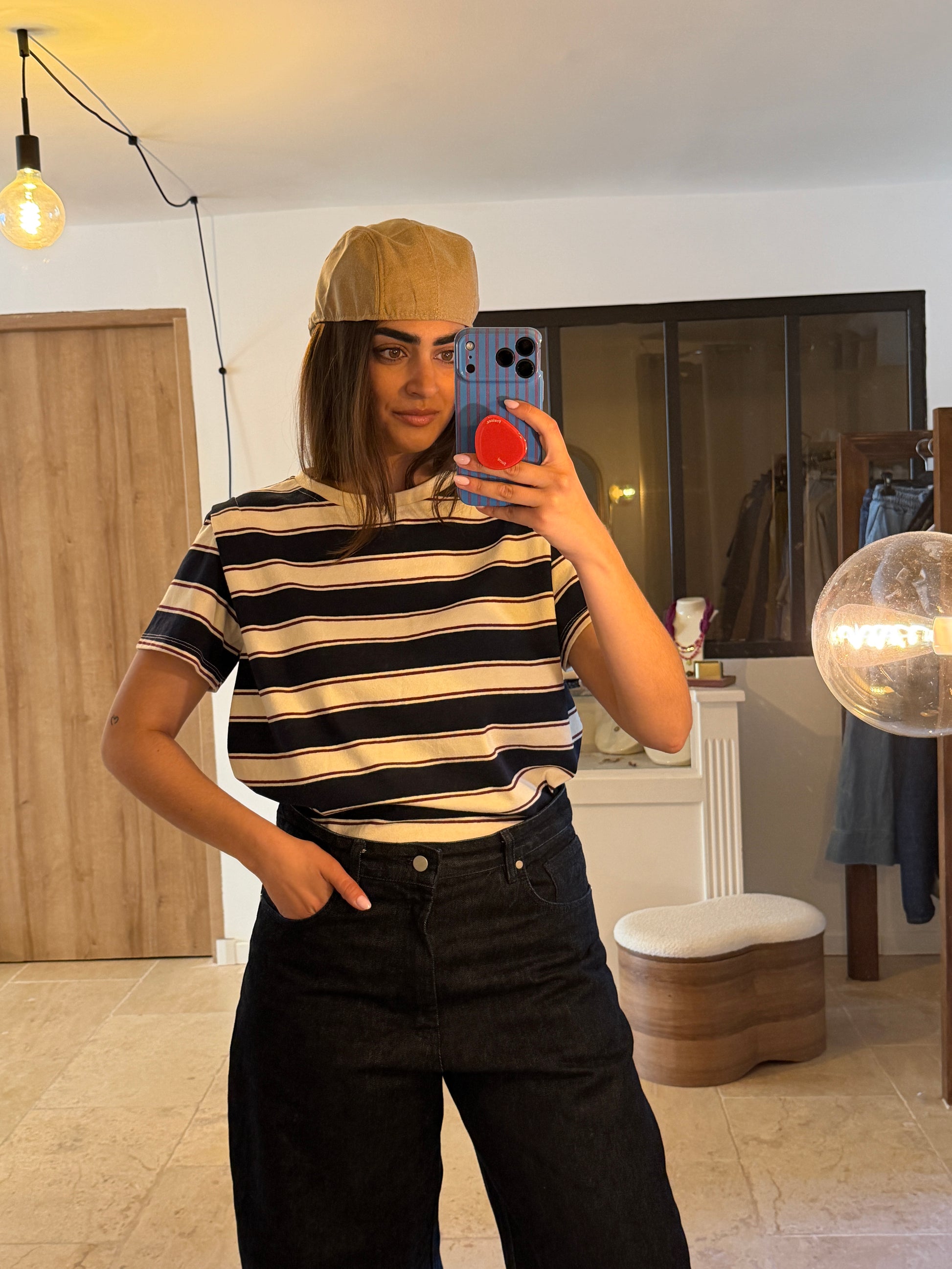 Sa coupe légèrement ample et ses manches courtes apportent un style décontracté et moderne. Les rayures larges contrastées donnent du caractère à cette pièce facile à porter au quotidien.